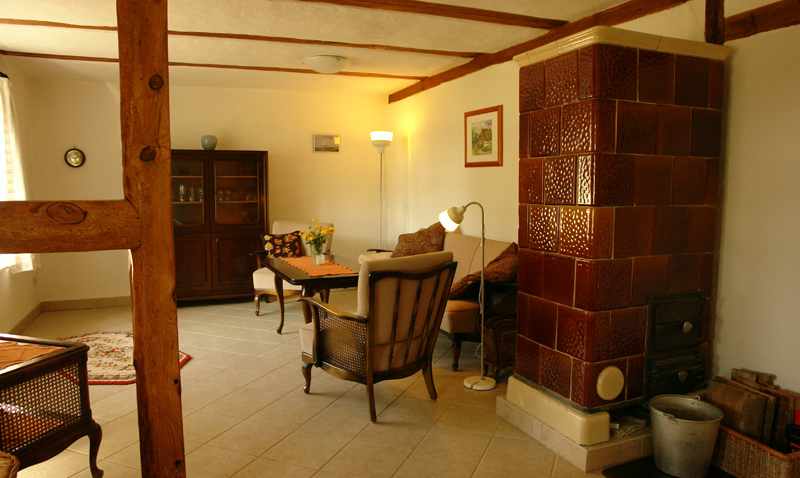 - Wohnzimmer mit Kachelofen, Fernseher im Satellitenempfang